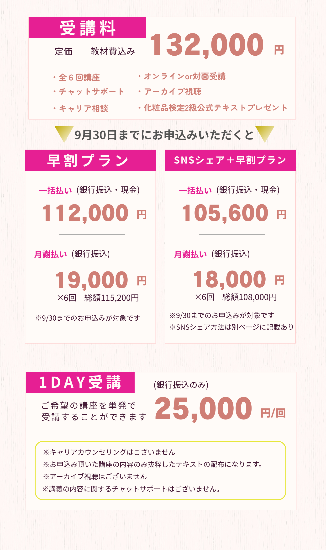 全6回 化粧品検定受験に向けた特別講座は 2026年4月に開催予定 詳細は別途ご案内いたします。 |