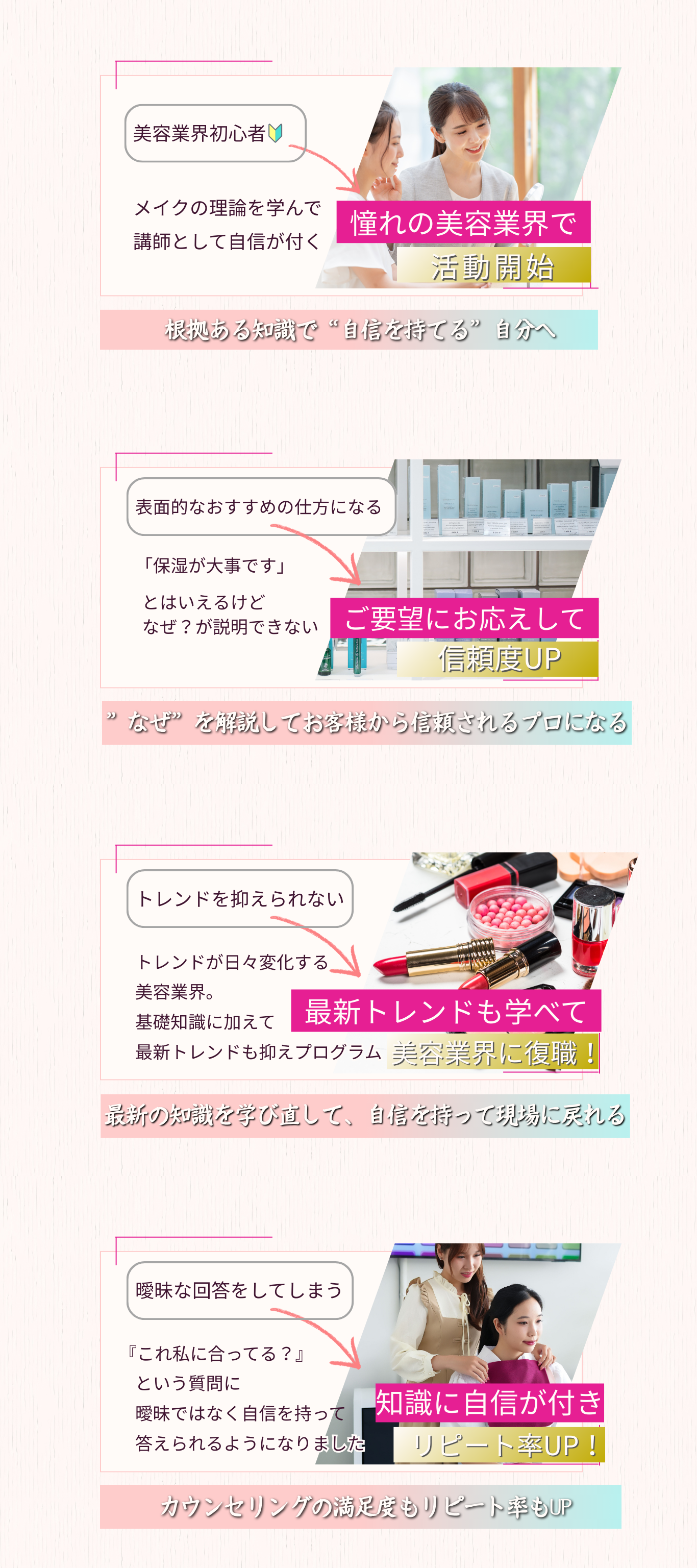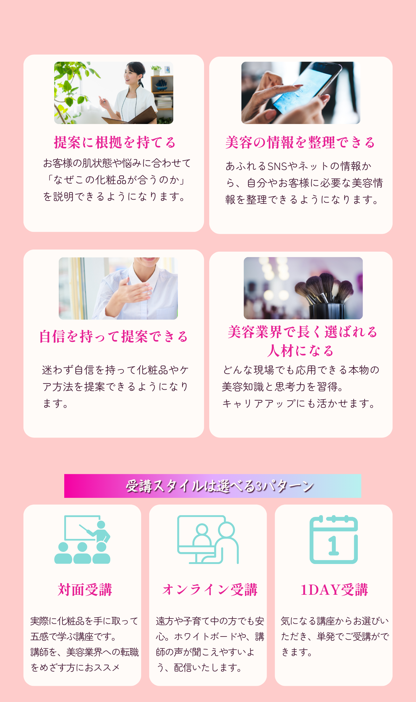 ◆化粧品検定公式テキスト2級プレゼント ◆講師監修の美容思考塾オリジナル対策問題 美容教育カリキュラム開発講師の監修! ※1DAY受講の方は、対象範囲のテキストを配布いたします。 |